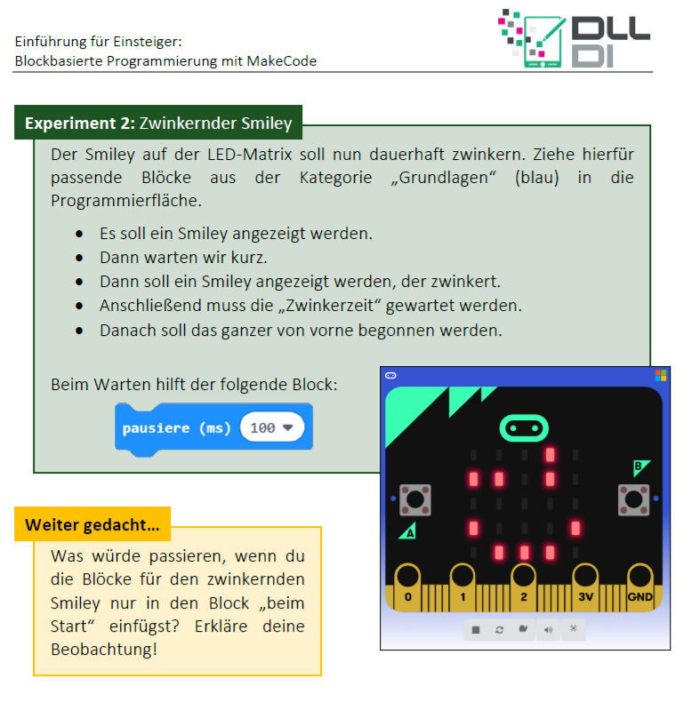 Viele Ideen und Inspirationen finden sich in den vorgegebenen Projekten unter makecode.microbit.org sowie auf der Website microbit.org. Als Erweiterung für den micro:bit ist aussderdem das „Inventor’s Kit“ verfügbar, welches viele zusätzliche elektronische Bauteile wie Motoren, Ventilatorflügel, Knöpfe, Widerstände oder LEDs enthält.