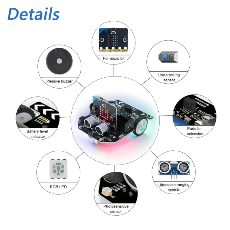 Der eine micro:bit ist der Kern der Fernsteurung, die über Bluetooth dem micro:bit auf dem Fahrgestell des Roboters die Befehle für die Ansteuerung der Motoren und den Einsatz der Sensoren gibt.