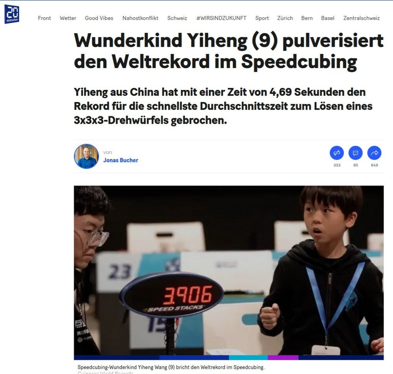 Das neunjährige Speedcubing-Wunderkind Yiheng Wang aus China hat mit einer Zeit von 4,69 Sekunden den Rekord für die schnellste Durchschnittszeit zum Lösen eines 3x3x3-Drehwürfels gebrochen. Yiheng hat damit die Würfelveteranen Max Park (USA) und Tymon Kolasiński (Polen) entthront, die gemeinsam den Rekord mit einer Zeit von 4,86 Sekunden hielten.