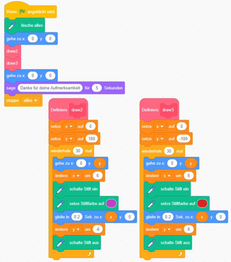 Achte dich genau, wie sich die beiden Blöcke draw2 und draw3 unterscheiden. Wir werden sie für alle andern Teilgrafiken verwenden, indem wir sie kopieren und nur leicht anpassen können.