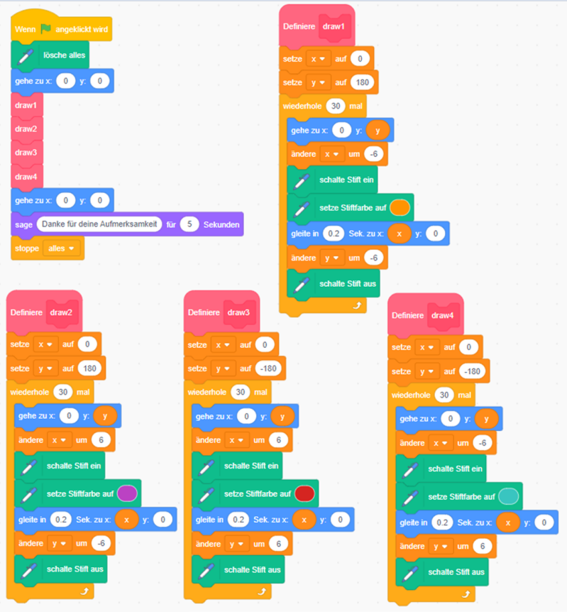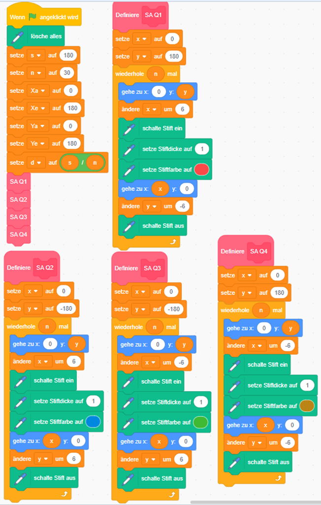 Hier werden die vier definierten Blöcke noch als separate Unterprogrmme verwendet. Dies hat den Vorteil, dass die Unterschiede besser erkennbar sind und wir leichter damit experimentieren können.