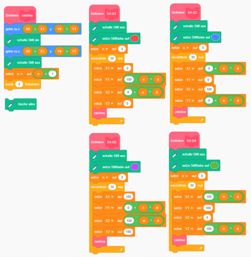 Den Programmteil, der für das Zeichnen der ersten Fadengrafik zuständig ist, verwenden wir neu als definierten Block, weil wir davon ausgehen, dass alle weiteren Fadengrafiken nach dem gleichen Muster realisiert werden.