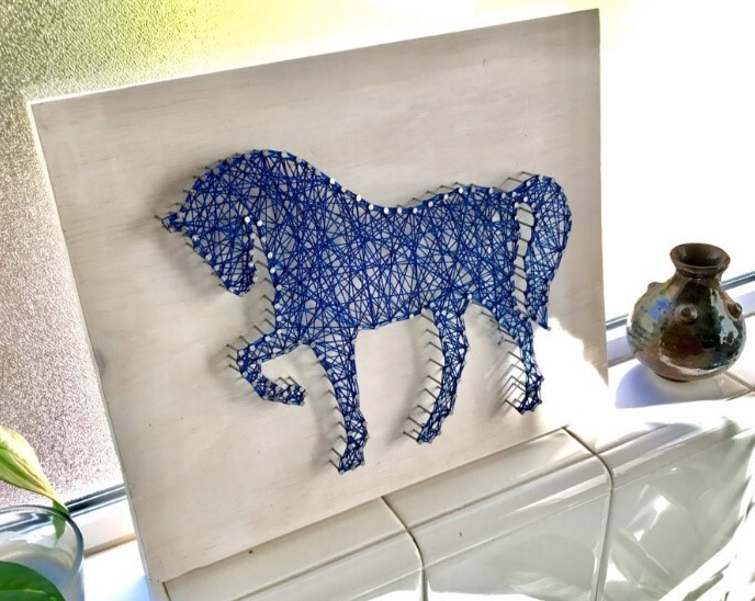 Werden zum Beispiel die Umrisse von Pflanzen (Blumen, Blätter, Blüten…) oder Tieren (Pferde, Elefanten, Schmetterlinge…) verwendet bezeichne ich diese als Fadenbilder. Handelt es sich dagegen um Figuren, bei denen die Anordnung der Nägel gleichmässig symmetrisch sind oder geometrischen Formen entsprechen, fasse ich sie als Fadengrafiken zusammen.