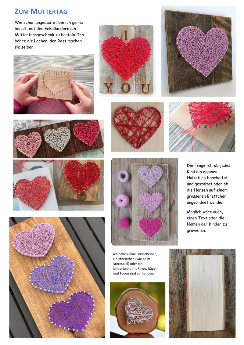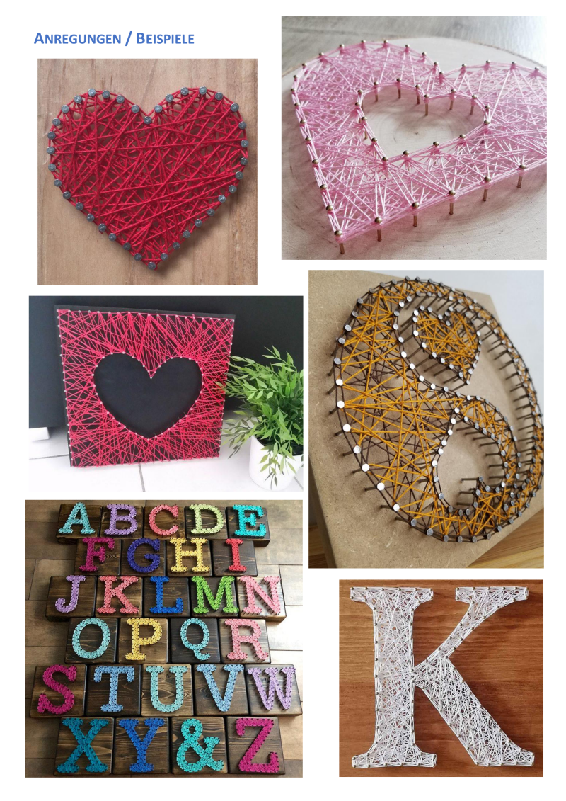 Fadenbilder mit dem Herz-Simbol sind sehr beliebt, weil sie mit kleinem Aufwand erstellt und auch von Kindern problemlos gestaltet werden können.